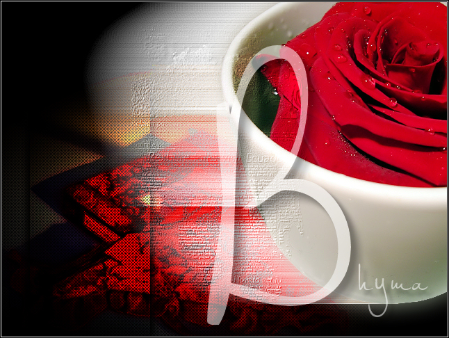 Ajustar - Desenfocar - Desenfoque Gausiano radio 15. Activar la capa de arriba para el siguiente paso.(copia (2) de a cup ) Capas - nueva capa de trama. Con la herramienta pincel, elige el pincel @cb-newsprint1, valores standart, tal como sale. Click tres veces en el centro de la imagen. Efectos - Efectos 3D - Sombra : hor/vert 1, Opacidad 100, Desenfoque 1, color negro. En la paleta de capas, cambiar el modo de mezcla a Superposición. Nueva capa de trama para el texto. En el plano de fondo el color blanco, y el primer plano cerrado. Activa la herramienta texto, y con la fuente Al Charisma, tamaño 500 px, Flotante. Escribe la primera letra de tu nombre. Anular la selección. Efectos - Efectos 3D - Sombra: hor/vert 8, Opacidad 60 Desenfoque 8, color negro. Colocar la letra como en el ejemplo. En la paleta de capas bajar la opacidad de esta capa a 51%. Nueva capa de trama, cambiar el tamño del texto a 72, y escribir el resto del nombre. Anular la selección y colocar, Repetir la sombra y bajar la opacidad de esta capa a 51%. Imagen - Agregar bordes - 1 px color negro Imagen - Agregar bordes - 1 px color blanco Imagen - Agregar bordes - 1 px color negro. Deja un mensaje en mi libro de visitas y hazme saber si te ha gustado esta lección Leave a message in my guestbook and let me know if you appreciate this lesson