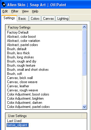 - Efectos - Complementos - Alien Skin - Snap Art - Impasto, busca el preset betsie_bhyma en la carpeta de materiales, doble clic y se instala automaticamente en la carpeta de presets del filtro.