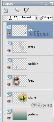 Abrir una imagen trasparente de 750 X 550 píxeles, rellenar con el gradiente, Copiar y pegar los tubes tal como se ve en esta paleta de capas: